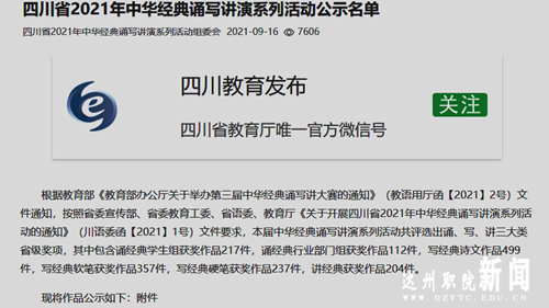 据四川教育发布消息,王梦娜老师讲经典作品《破阵子·为陈同甫赋壮词以寄之》、徐丽丽老师讲经典作品《观书有感》荣获四川省2021年中华经典诵写讲演系列活动大学教师组三等奖。