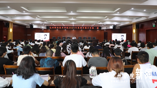 蒋伟从达州人民对抗日战争的贡献、红军药房见证军民鱼水情、河南抗洪中党员冲锋在前等现实案例出发,生动诠释了我党百年奋斗间,一代又一代中国共产党人顽强拼搏、不懈奋斗、视死如归、忘我奉献的伟大奉献精神。结合2020东京奥运会上为国争光的中国健儿们顽强奋斗、百折不挠的鲜活事例,他勉励全院学子,要以伟大建党精神作为勇往直前的动力之源,以实现中华民族伟大复兴为己任,不负时代,不负韶华,不负党和人民的殷切期望,主动担起强国重任,做新时代有为青年。