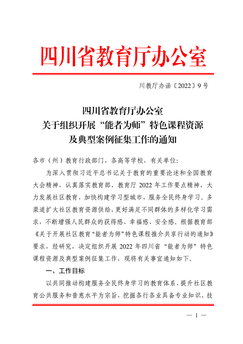 四川省教育厅办公室 关于组织开展“能者为师”特色课程资源 及典型案例征集工作的通知